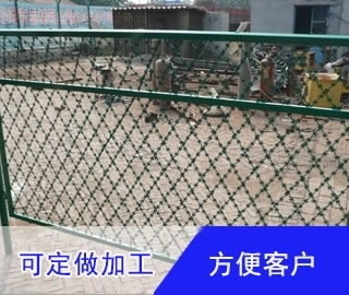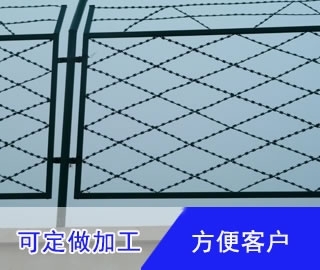2. 刀片刺绳与围栏网片组合而成的一种,常用在机场、监狱、看守所、边防等重安全防护场所,一般采用高强度低碳钢丝焊接成高强度网片,热镀锌刀片刺绳,Y型矩形钢立柱组合而成,网片中可带有V型加强筋,增加护栏的抗冲压力。
